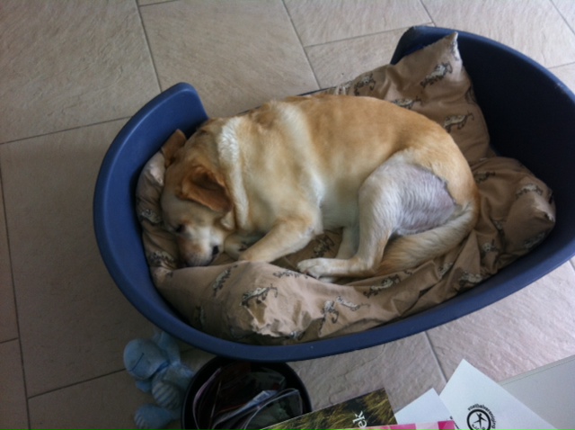 Loslopen in huis gaat ook goed. 1 maal richting deur, maar gelukkig op vier poten. Ook vind ik het gewoon gezellig dat ze aan mijn voeten ligt. Ook heeft ze heerlijk in de mand liggen pitten. Als vanouds zal ik maar zeggen.