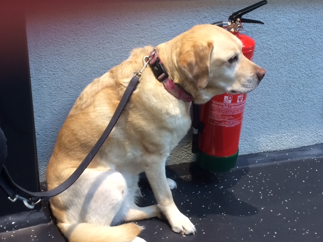 Zo rustig naar Utrecht gereden en we waren daar keurig op tijd. Jolanda heeft ons gemeld en daarna zijn we met haar naar binnen gegaan. In de auto had ze al door waar we waren.. want ze zat gelijk te trillen. Bij binnenkomst zocht ze een plekje op tegen de muur aan.. Het is dat ze niet in de muur kon kruipen… maar ja. Ze vond het gewoon eng. Zie ook de foto… ze zit tegen de muur aan bijna bij een brandblusser die er ook toevallig hing. Ze kijkt echt zo van ”’je ziet me niet, ik ben er niet”.